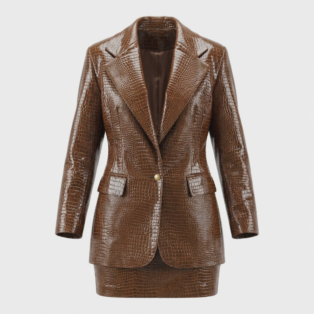 Bellissimo e originale completo in pelle stampa cocco con blazer a un bottone e miniskirt a vita alta. Da indossare a completo o separatamente. Qualsiasi imperfezione o difetto di questo capo è dovuto alla sua vita precedente, amalo anche per questo.